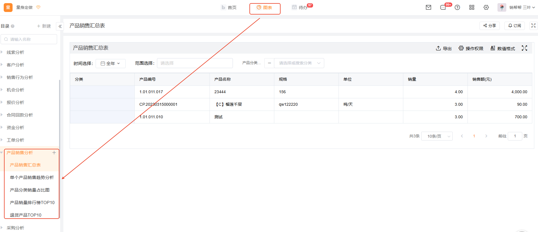 ●产品相关系统图表统计,多为对主业务关联产品表的统计。举个栗子,对产品销量的统计,其实是对合同销售产品表的销量情况进行统计