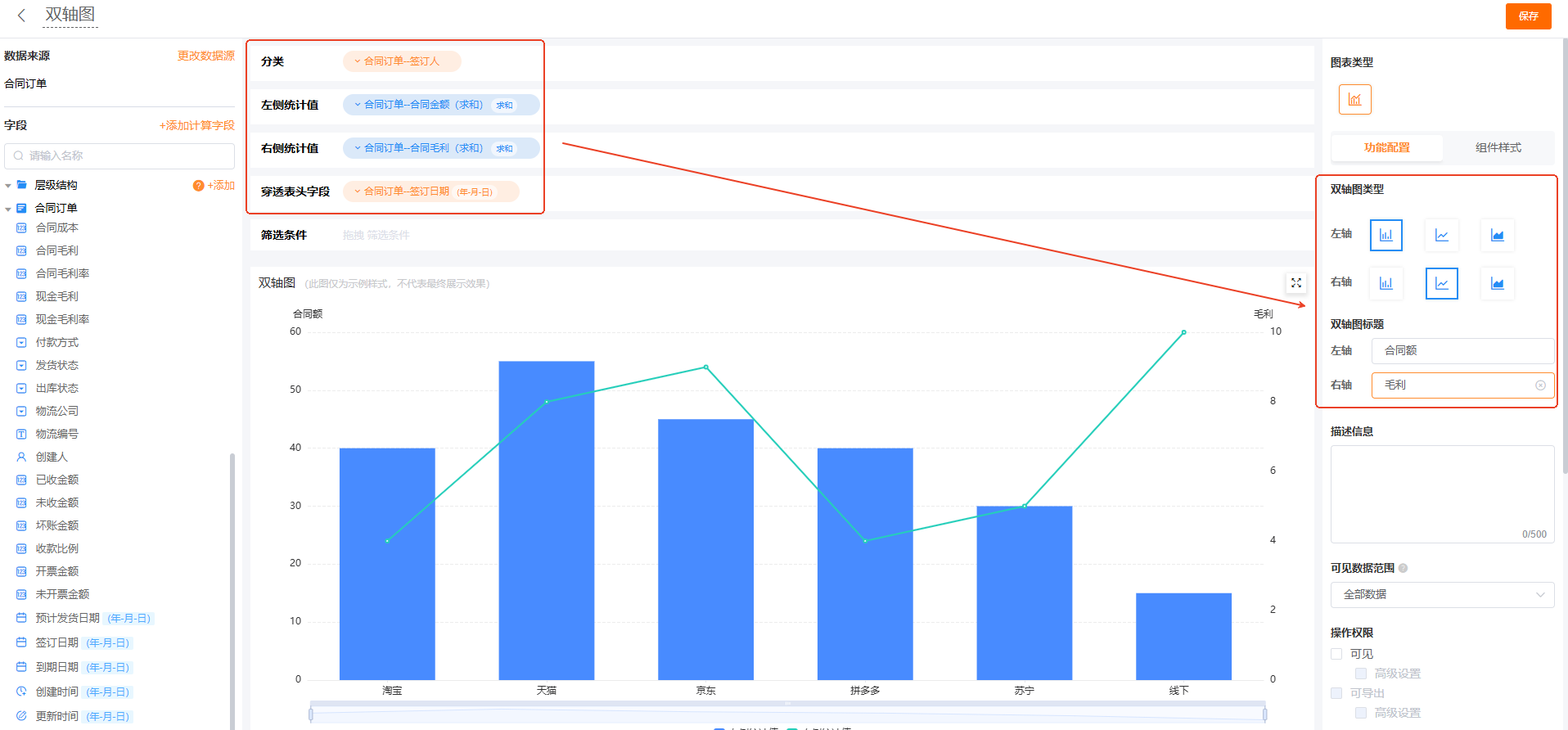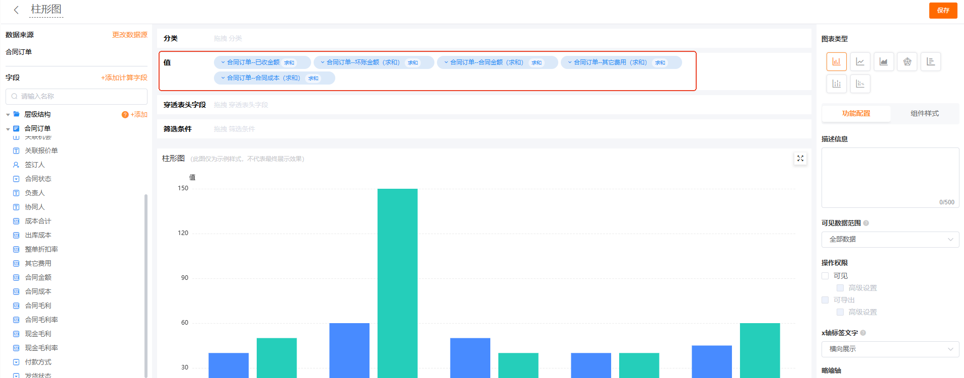 操作入口: 图表中心 》对应仪表盘 》编辑》新建柱形图》添加多个需要统计的字段