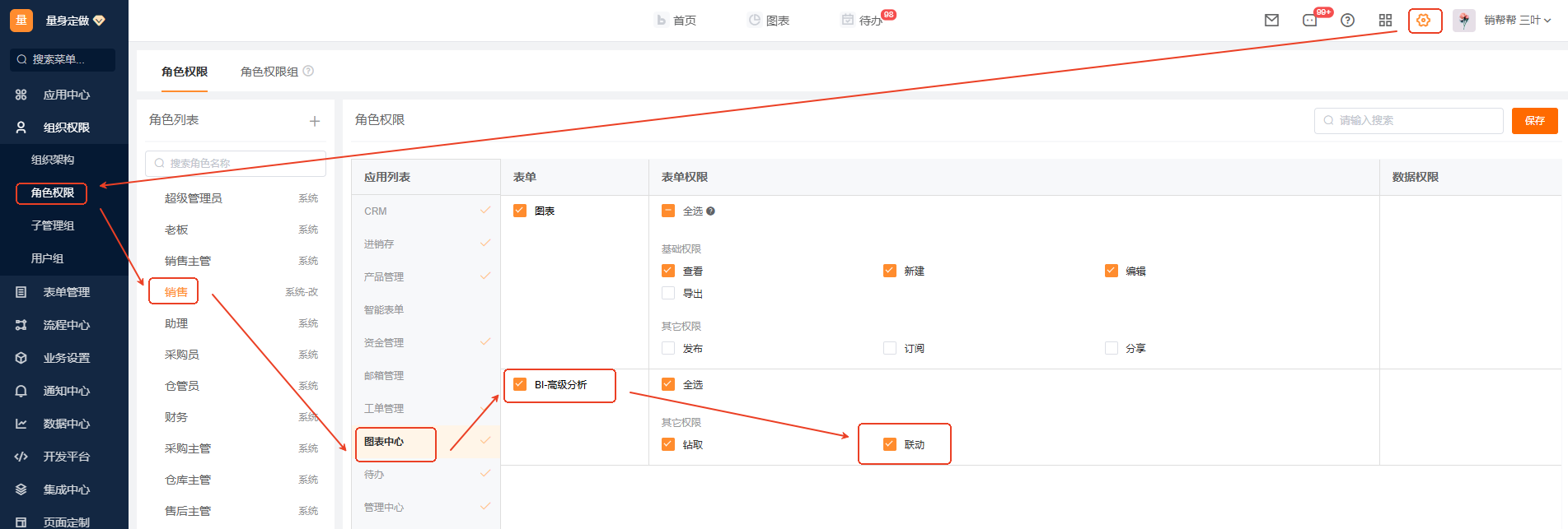 自定义图表联动 (1)需求场景 (2)套餐版本 (3)操作路径 (4)详细信息 (5)注意事项 (1)需求场景 在数据分析过程中,时常会对同一数据源进行不同维度的可视化分析(例如,在商机分析仪表盘中,既需要按人员维度分析各自的在途商机数量及金额,也需要按照产品维度来分析对应的商机数量及金额),此时,频繁地配置和使用筛选条件/查询条件会打断用户的“分析流程”,允许用户通过直接点击图表中的“兴趣点”即可将其他关联的图表也聚焦到同样的数据范围下,使得用户能更快速进行业务分析。 (2)套餐版本 需求版本:仅旗舰版; (3)操作路径 管理中心 – 分配联动权限图表中心 – 选择图表 – 设置联动 – 点击图表触发联动授予对应角色权限(图表中心—BI高级分析—联动) (4)详细信息 在仪表盘中选择某个图表,点击更多,进行联动设置 勾选想要联动的图表 点击图表中的区域,可以选择“联动”交互 效果动图如下: (5)注意事项 注意事项1:联动设置分为联动图表和被联动图表。上述例子中,通过饼图设置了图表联动,那么饼图就可以主动触发联动的交互。在这个界面中选择的可联动图表是点击饼图后,数据会跟着变化的图表。 注意事项2:联动相当于是将当前点击的图表维度作为筛选条件带入其他图表。注意事项3:目前支持联动的图表注意事项4:联动和钻取不支持同时开启