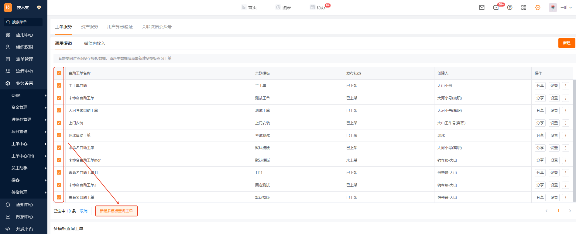 功能说明:批量选择后,点击 新建多模版查询工单”,允许终端用户在一个接内查询多工单模版最多允许选择5个客户自助工单模,且同个工单模版下仅允许选中