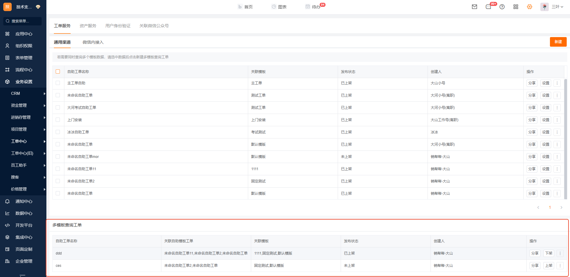 此处会展示所有工单模版配置的客户自助工单,并按照渠道进行展示;