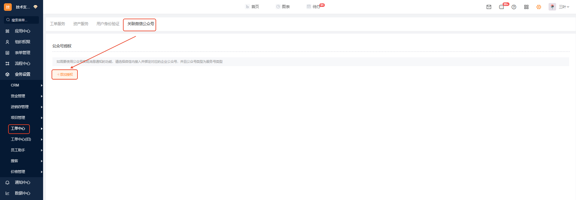 功能入口: 管理中心-工单中心-客户自助工单-关联微信公众号
