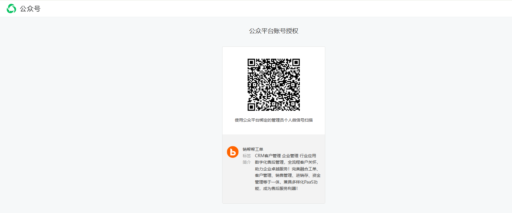 此处可以进行公众号的授权界面: 要求企业公众号为服务号类型,授权流程为微信授权流程,在三方页面进行操作.