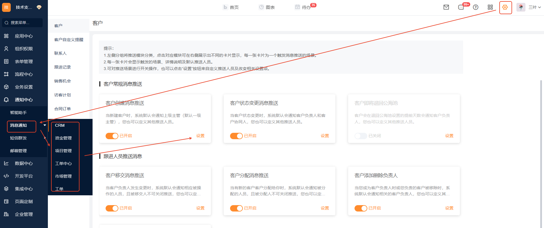 3.可对推送场景进行开关操作,也可以点击“设置”按钮来自定义推送人员及改变相关设置项。