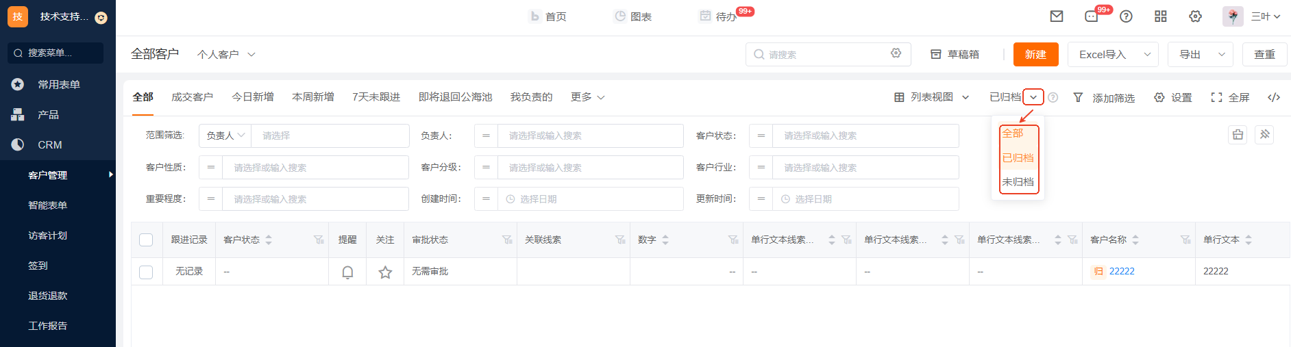 归档与未归档的区别? Q:归档与未归档的区别? 归档是对不需要再跟进的客户、合同,又不能删除相应记录,就把他进行归档。归档之后不再列表页显示。在客户列表和合同列表上有个归档筛选可以把以归档的筛选出来,简单的理解就是做分组区别,不影响公海池规则的掉入。