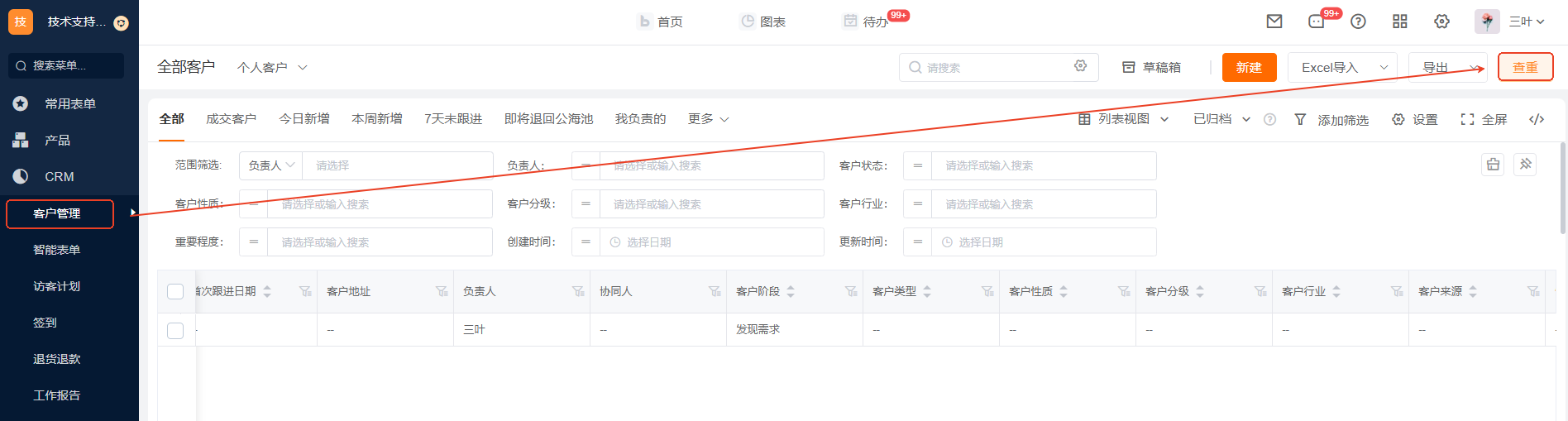 为什么提示“客户名称值存在重复”或者提示“电话值存在重复” Q:为什么新建客户时提示“客户名称值存在重复”或者提示“电话值存在重复”? 如果录入系统时提示客户名称存在系统,但是在全部客户中无法搜索到客户,我们可以通过查重进行查看客户所在位置 主要字段: 负责人:当前客户的负责人,如果负责人是其他人,表示客户在其他人账号下; 所属位置:客户在哪个列表;「客户列表」表示在CRM 》客户管理 》全部客户中;「公海池客户」表示在CRM 》客户管理 》客户公海池中;审批列表表示在首页 》审批中; 表单名称:表示客户在哪张表单的数据中,客户存在多模版情况,需要到对应表单中查询; 是否归档:显示“是”,需要到已归档中查看;显示“否”,需要在未归档查看请参考:【是否归档设置参考】