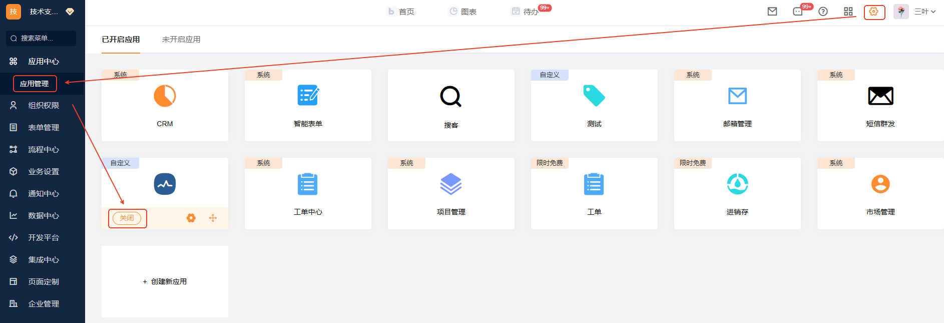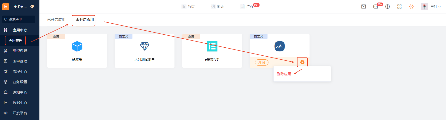 自定义应用的删除需要先在管理中心 》应用管理的已开启应用中先关闭应用,然后再去未开启应用中删除应用