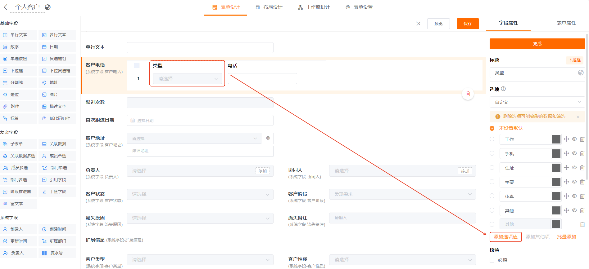 客户电话的「类型」字段如何修改? Q:客户电话的「类型」字段如何修改? 如果需要修改客户电话中的「类型」字段信息,可以到 管理中心 》表单管理 》表单模版 》CRM 》客户管理 》编辑,点击类型字段修改或则添加。