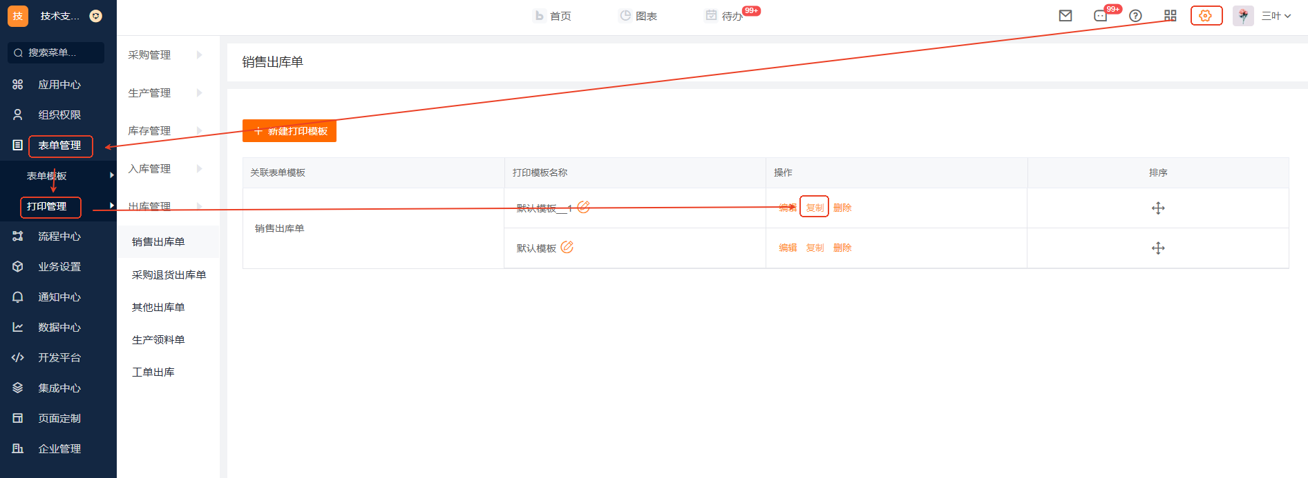 如何复制打印模版? Q:如何复制打印模版? 【场景】 很多企业一个表单会创建多个打印模版,来适应不同的使用场景,比如一个合同表单会设置多个打印模版,但是每个打印模版基本内容相同,只是修改个别参数,如果重新建立非常麻烦,所以销帮帮推出了打印模版的复制功能。 【操作入口】 管理中心 》 表单管理 》打印管理 》选择需要复制的应用表单 》点击【复制】